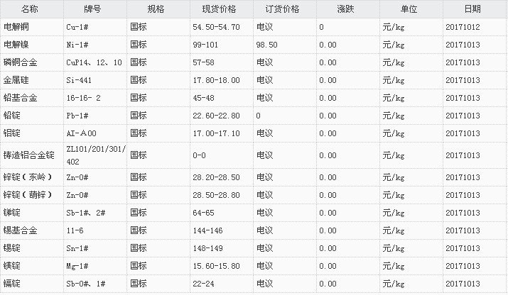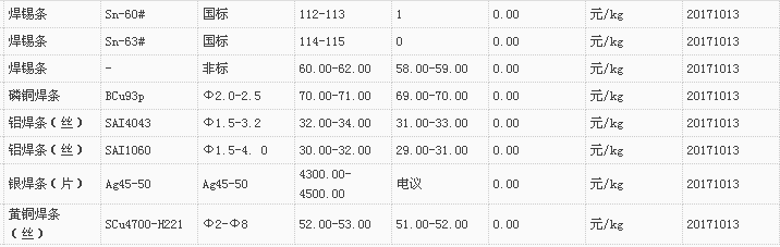山东有色金属网2017-10-13炉料焊材类现货报价