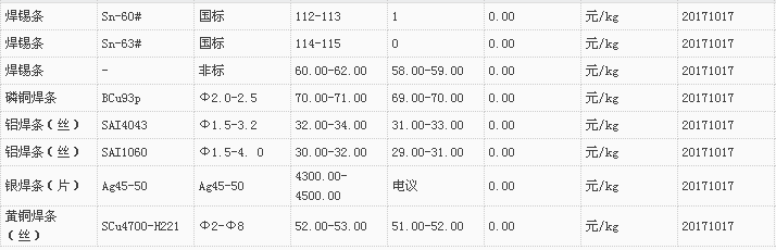 山东有色金属网2017-10-17炉料焊材类现货报价