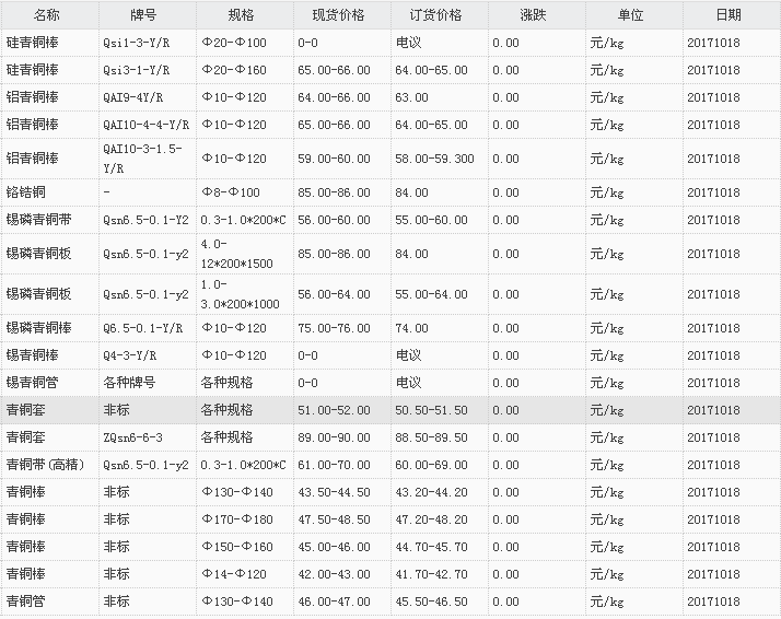 山东有色金属网2017-10-18青铜类现货报价