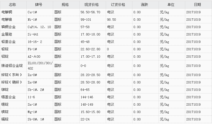 山东有色金属网2017-10-19炉料焊材类现货报价