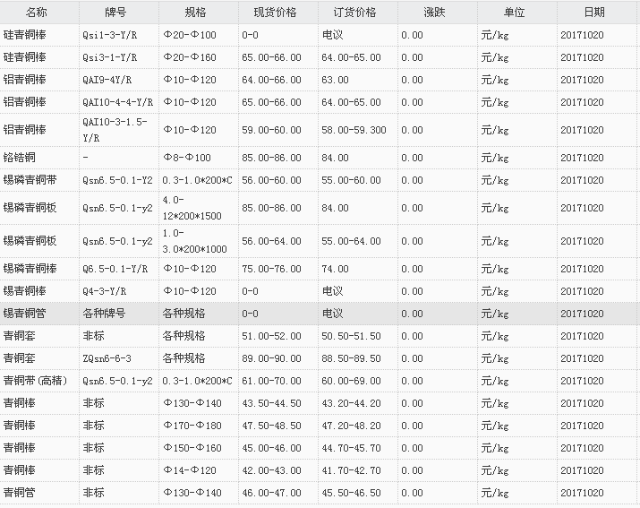 山东有色金属网2017-10-20青铜类现货报价