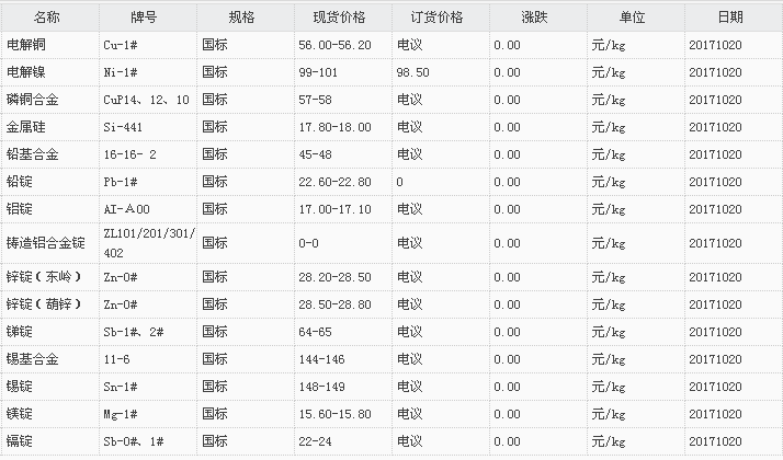 山东有色金属网2017-10-20炉料焊材类现货报价