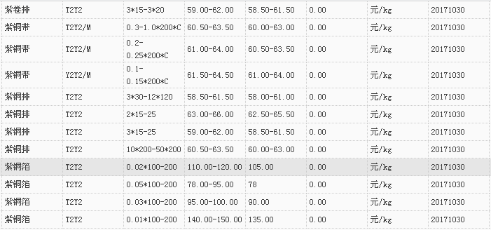 山东有色金属网2017-10-30紫铜类现货报价