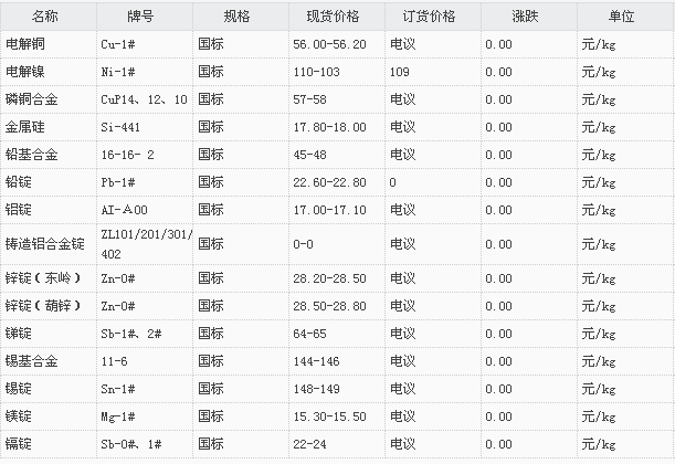 山东有色金属网2017-11-6炉料焊材类现货报价