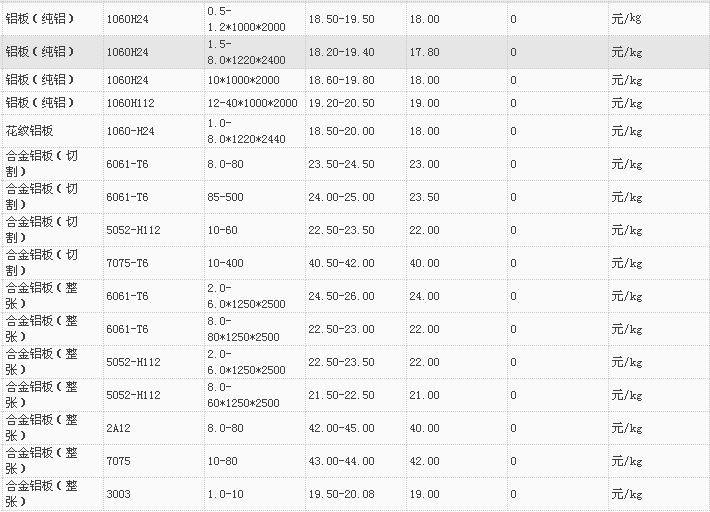 山东有色金属网2017-12-4铝材类现货报价